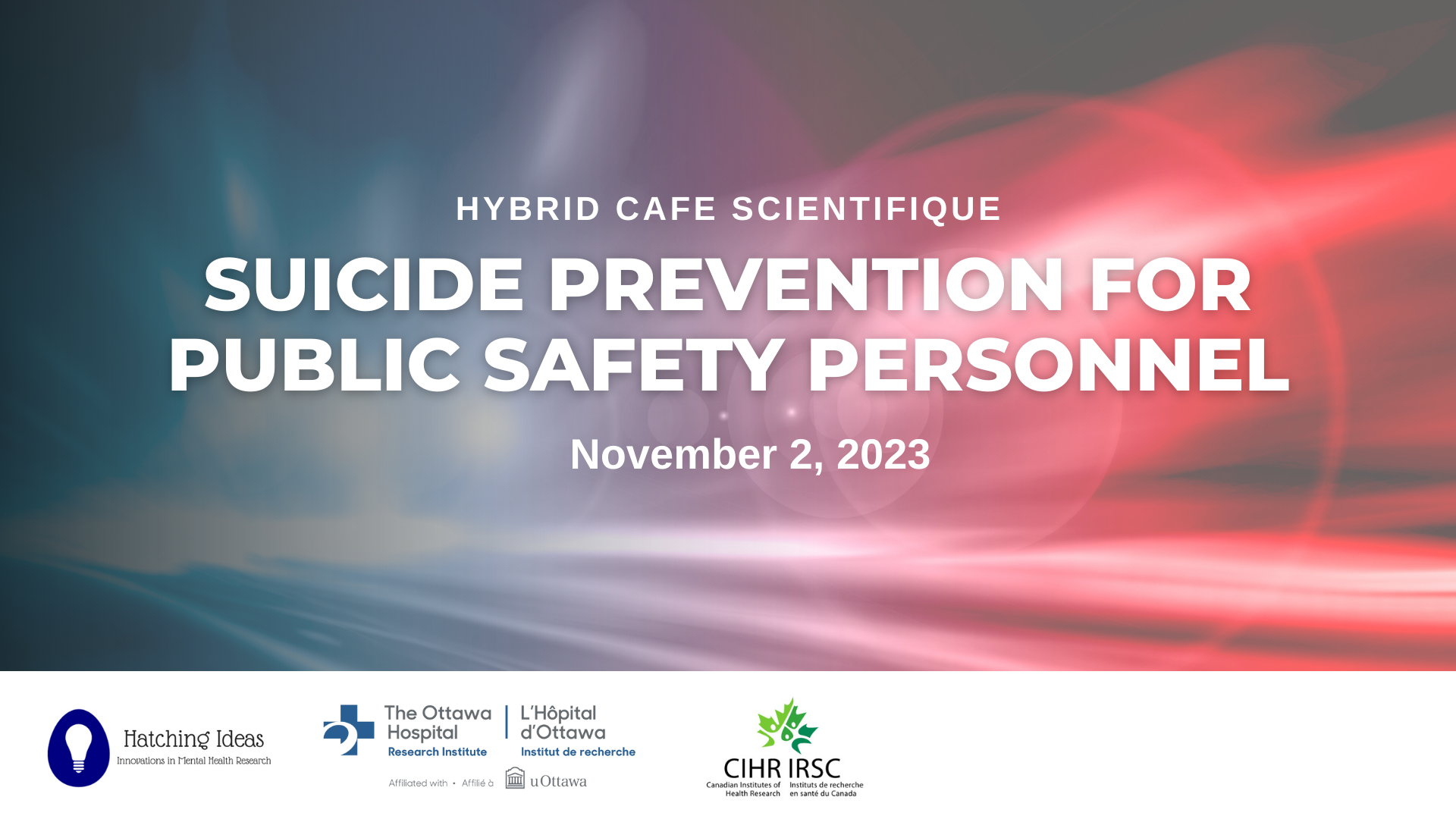 The Café Scientifique: Suicide Prevention for Public Safety Personnel was a forum for researchers, clinicians, public safety personnel, and the general public to discuss the alarmingly high rates of suicide among this group and how this can best be addressed. It featured two presentations followed by a panel discussion with the speakers.