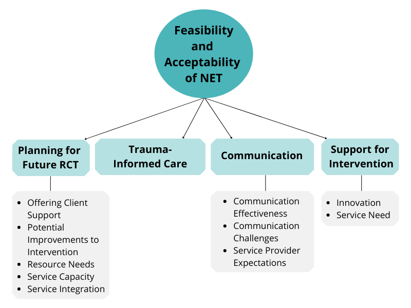14 participants were included in the study (7 in each group). Some participants dropped out of the study but this mostly happened before starting therapy. Once participants started the therapy sessions, 80% went to all of their therapy sessions and 70% completed all of the study questionnaires. The service providers we interviewed pointed out that the treatment we offered is badly needed because homeless and vulnerably housed patients have so few options. They also explained that in a future study, they would like to know more about NET and would like more effective communication with the study team.
